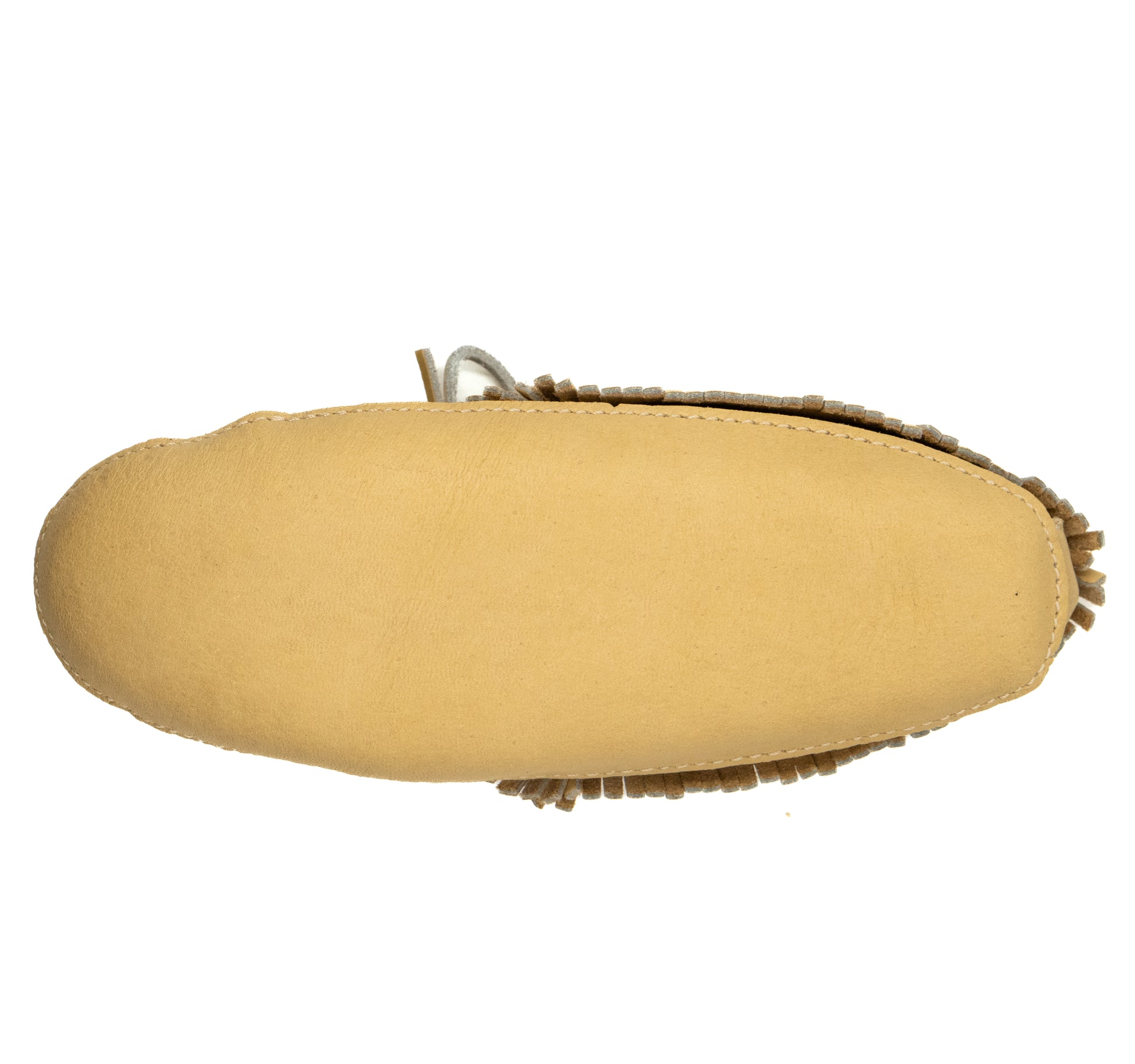 Made of moose hide and fringed is a sure bet. The double sole makes it an all-purpose moccasin that can be worn at the cottage by the fire or at the restaurant with friends.